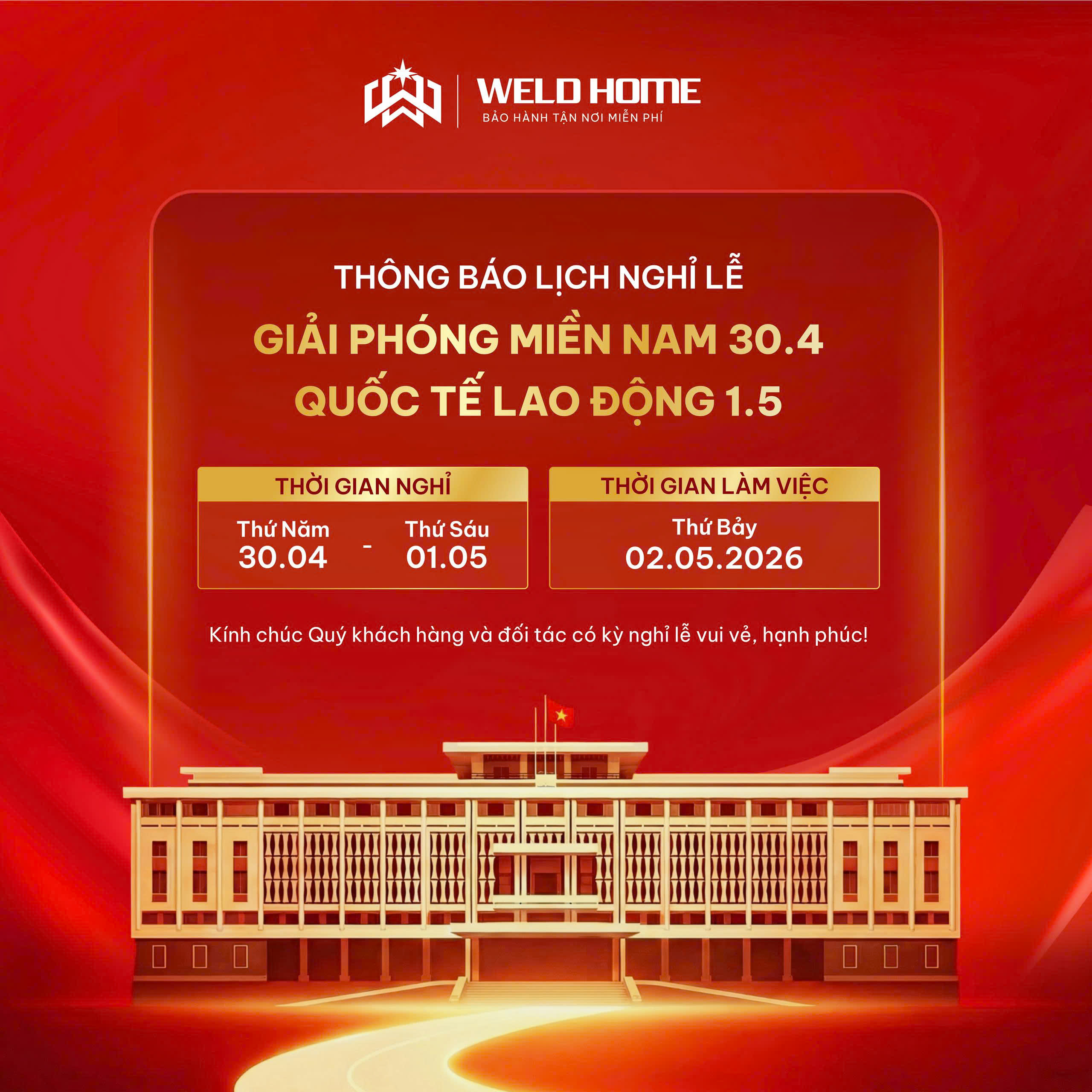 Trong không khí hân hoan chào mừng ngày lễ lớn của đất nước, Công ty Weldhome xin gửi lời chúc sức khỏe, hạnh phúc và thành công đến Quý khách cùng gia đình.